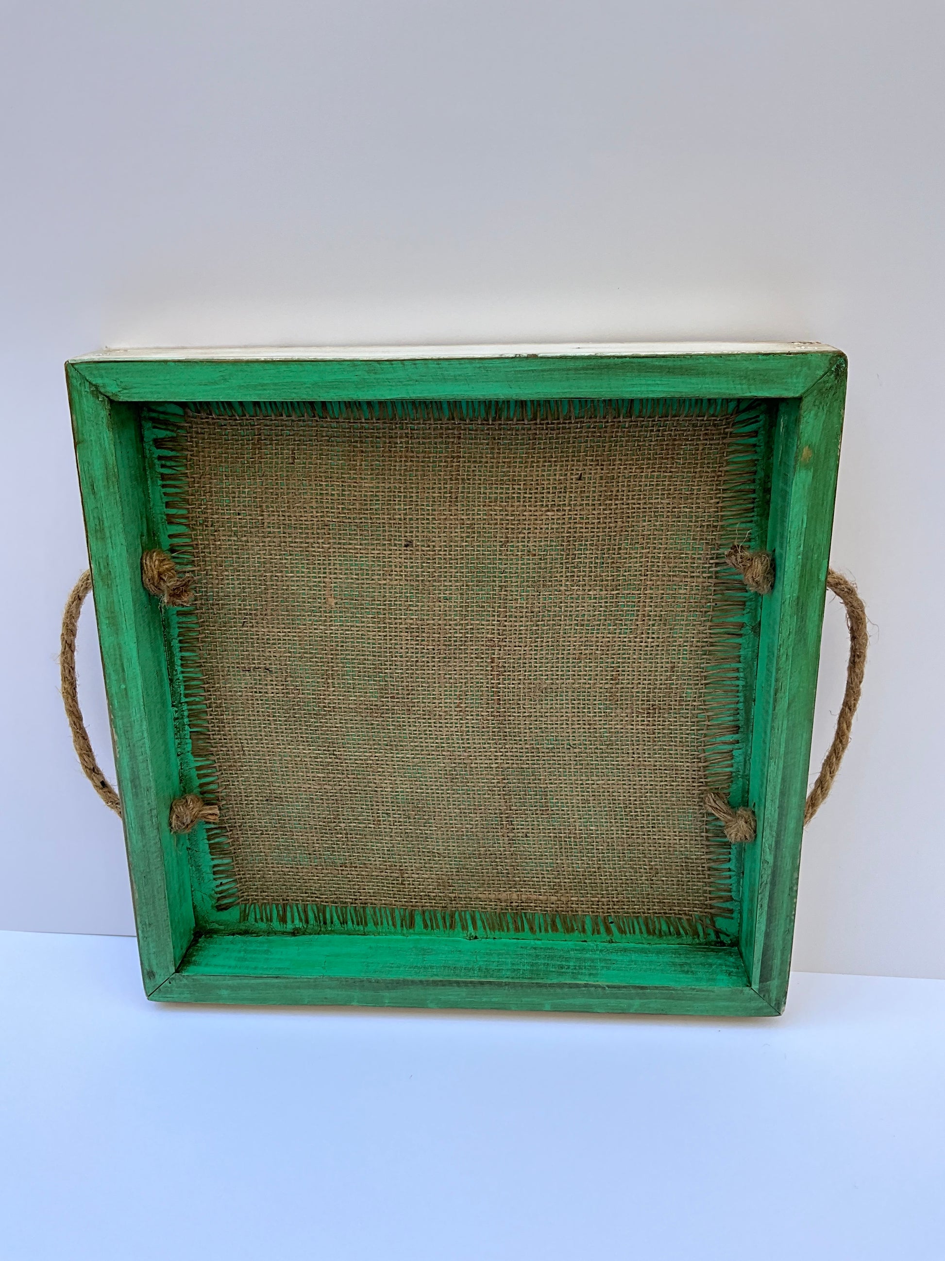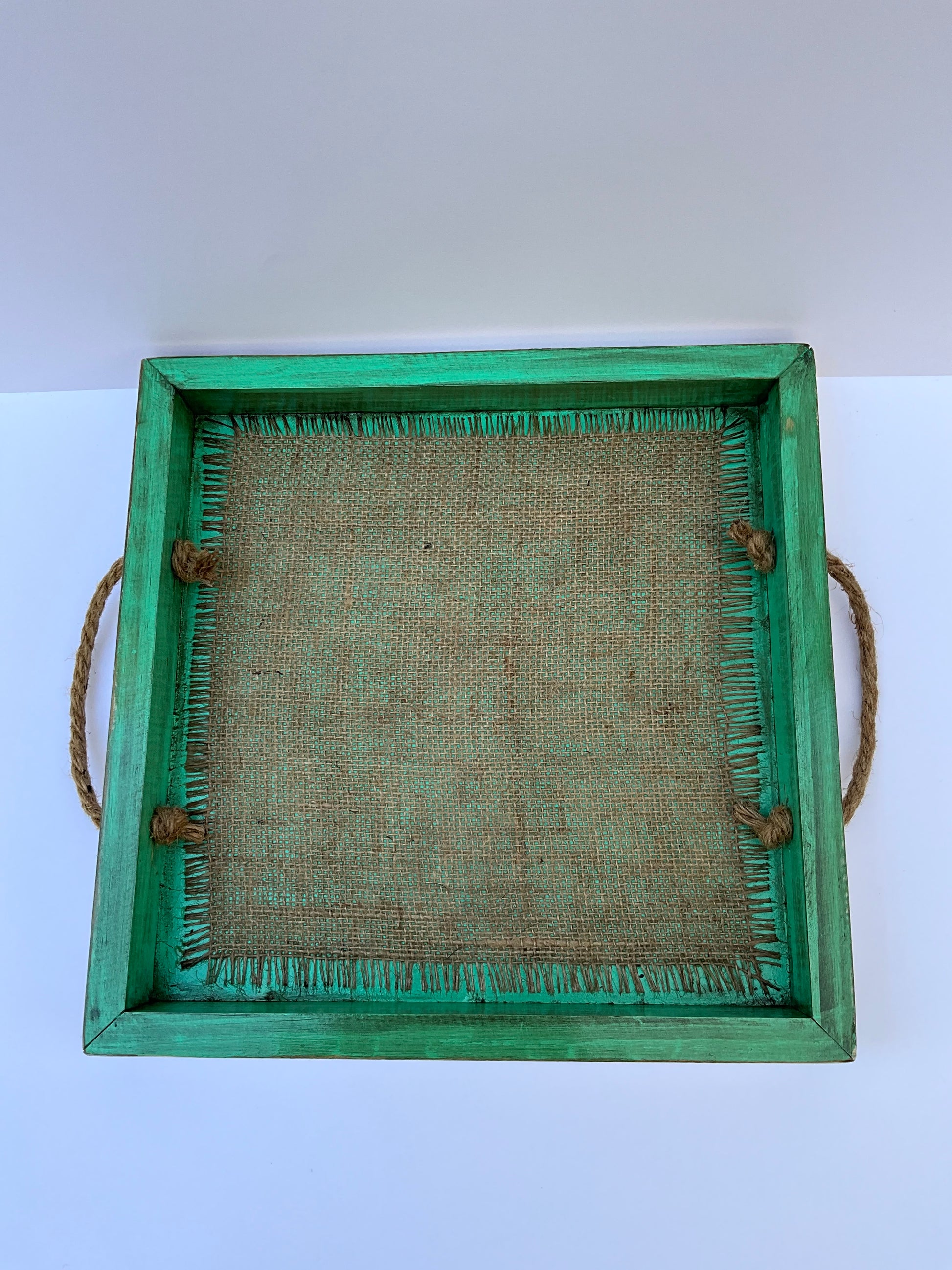 Bandeja de madera pintada color turquesa decapado con mangos de cuerda de yute y fondo en arpillera.