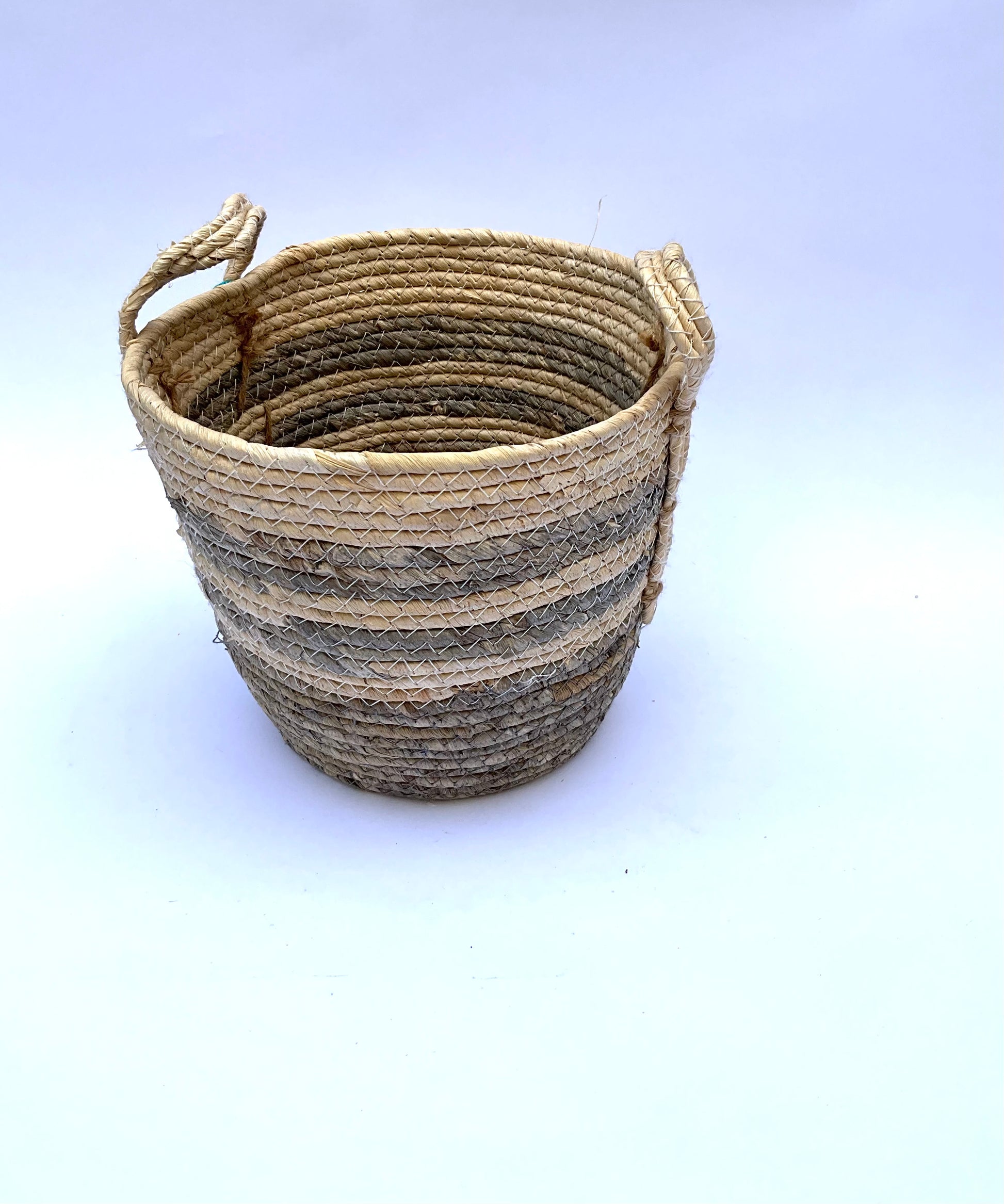 Canasto redondo de fibra natural tejida, color gris y natural.