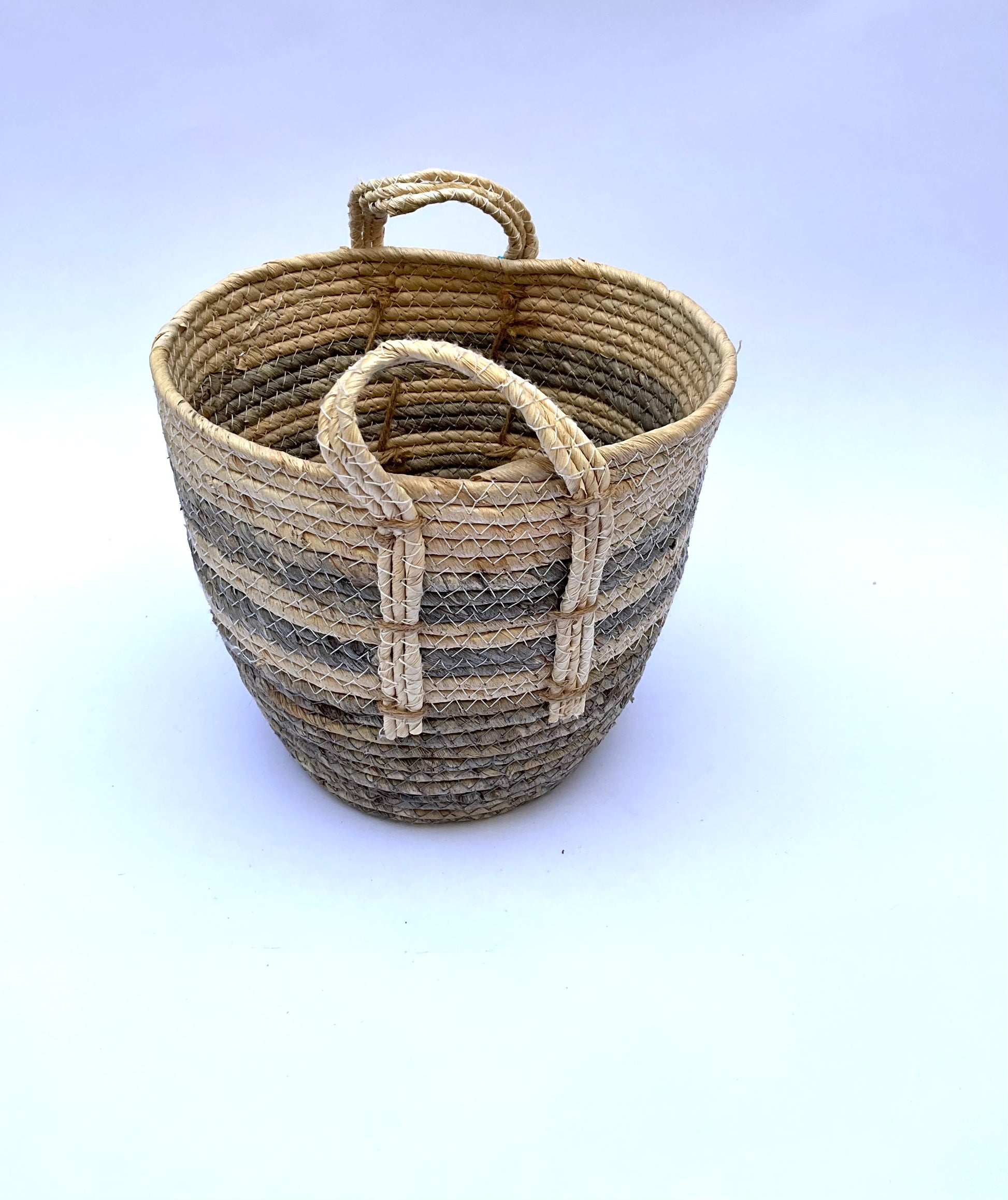 Canasto redondo de fibra natural tejida, color gris y natural.