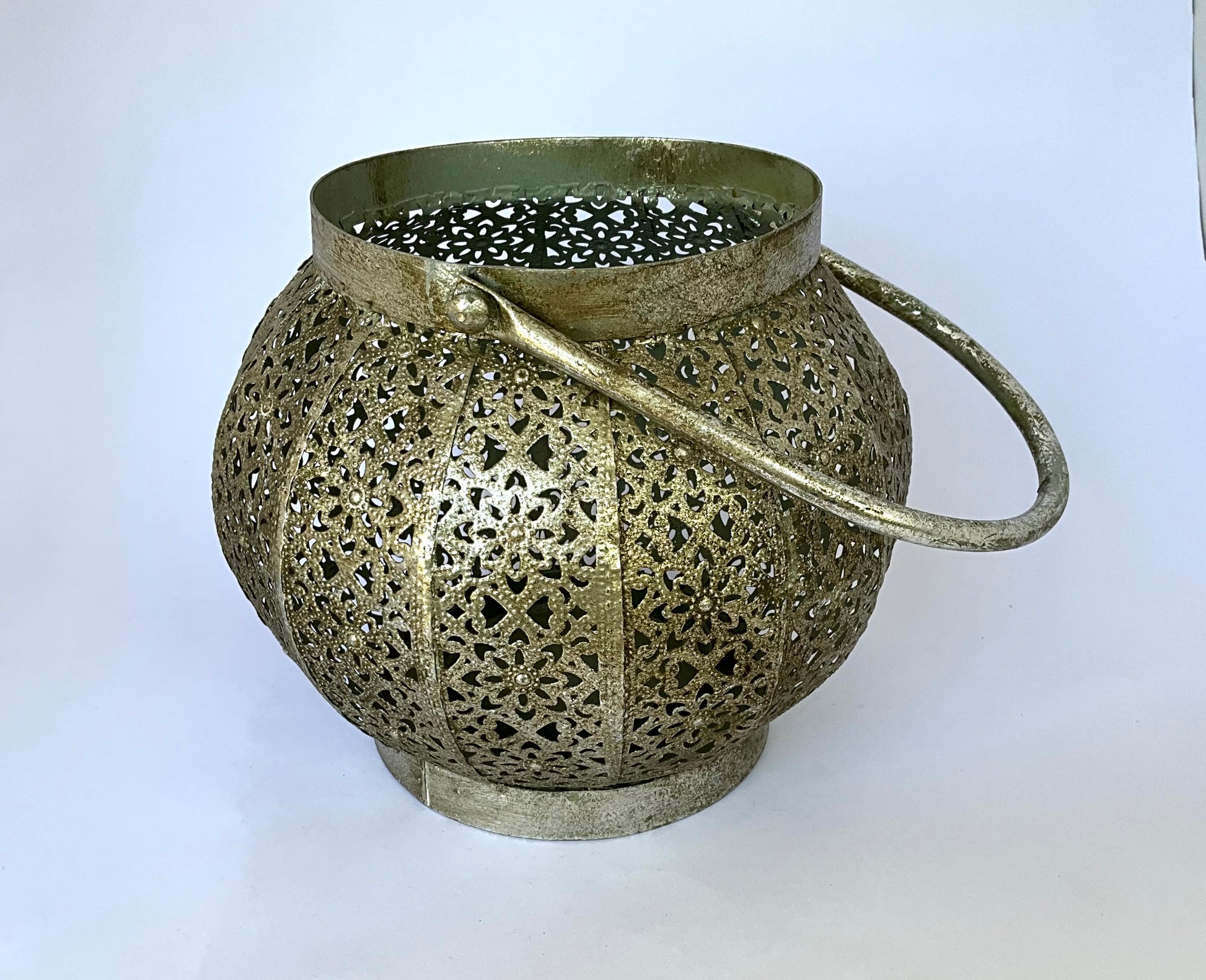 Candelabro de metal calado en forma de canasto. Incluye vaso de vidrio al interior para cubrir la vela por lo que se puede usar tanto en interiores como exteriores y el viento no la apaga!