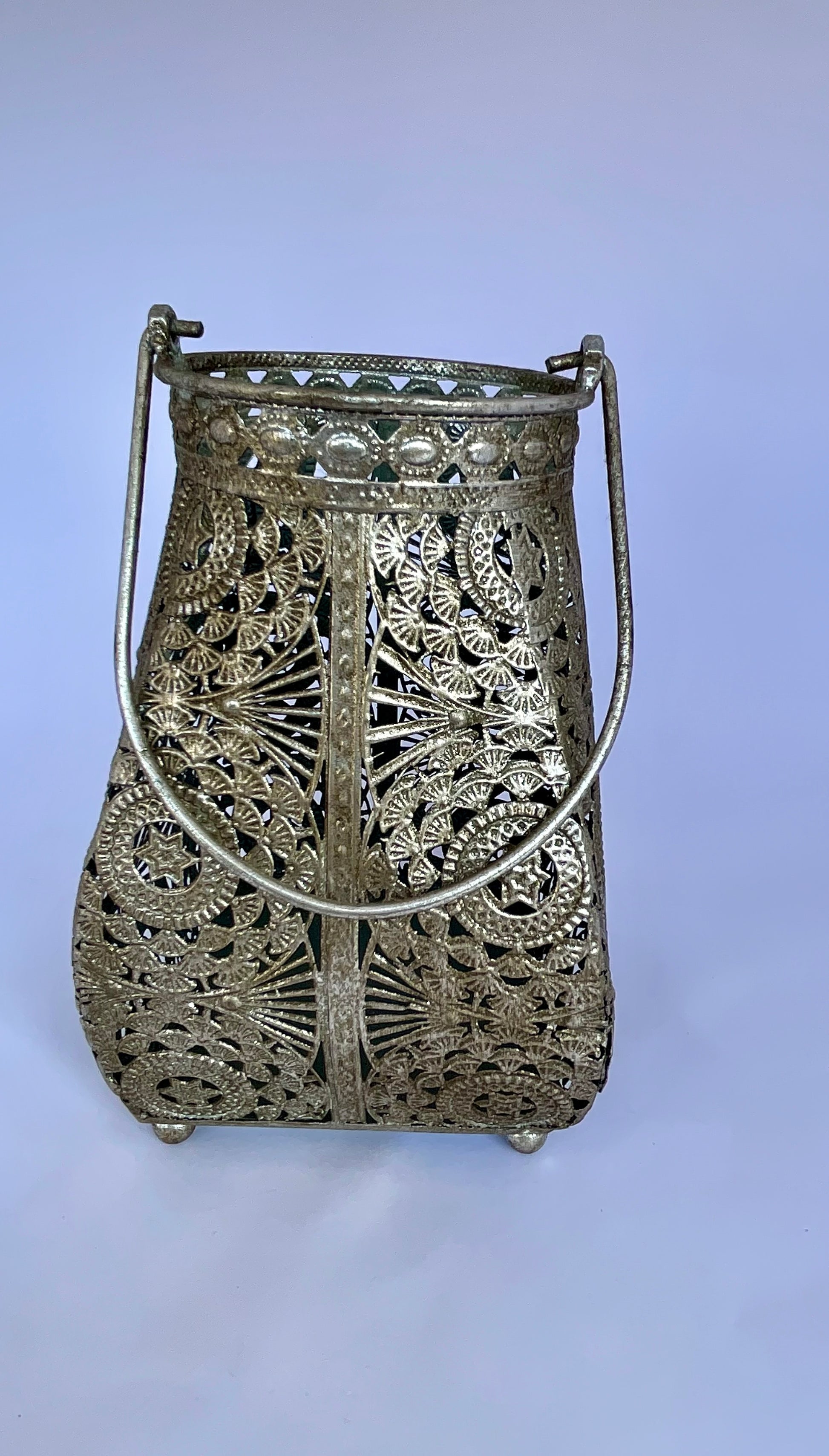 Candelabro metálico calado con forma de vasija alargada con mango. En su interior con vaso de vidrio para proteger la vela.